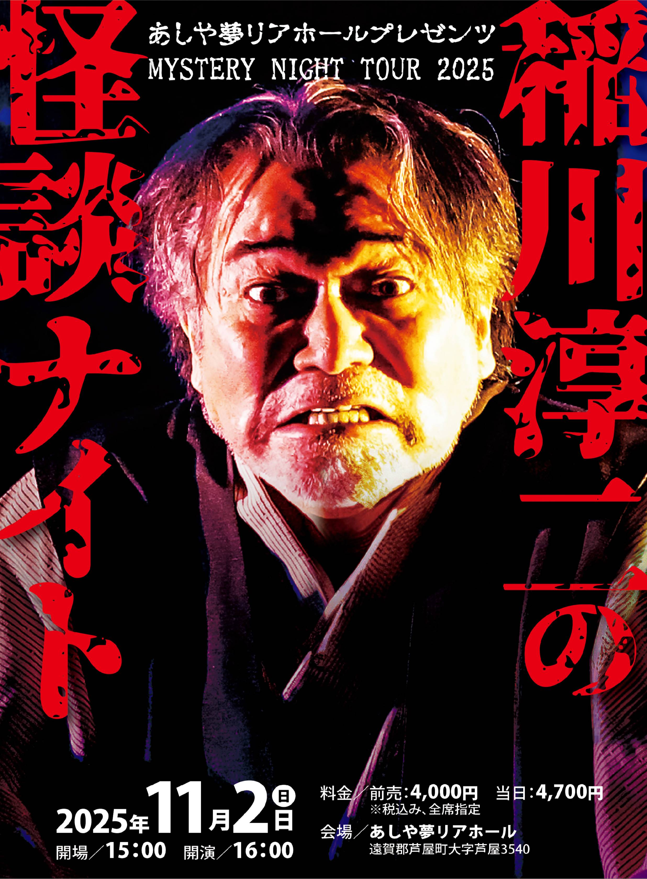 簡単に情報が手に入る時代だからこそ、 目に見えないものへの憧れや興味が高まる。 そんな人々の心を満たすのが「怪談」。 怖さの裏に、奥深さや優しさ、 教えや思いやりが確かに共存している稲川怪談・・・・ 怪談をエンターテインメントの域まで昇華させた 稲川氏の卓越した語りは 心に深く刺さり、感性を強く刺激する。 【稲川淳二プロフィール】 1947年8月21日 東京都渋谷区生まれ 工業デザイナーとして専門学校や短期大学にて教鞭をとる。 1996年個人でデザインを手がけた「車とめ」が通産省(現・経産省)選定の グッドデザイン賞を受賞。 元祖リアクション芸人として、そして怖い話を得意とする 人気タレントとして茶の間を賑わせていた45歳の年に 怪談ライブを始め、反響の大きさに感銘を受け、残りの人生を 「怪談家」として没頭する事を決意する。 1993年から休むことなく継続してきた「怪談ナイト」・・・ 今年もあいつがやってくる・・・ |