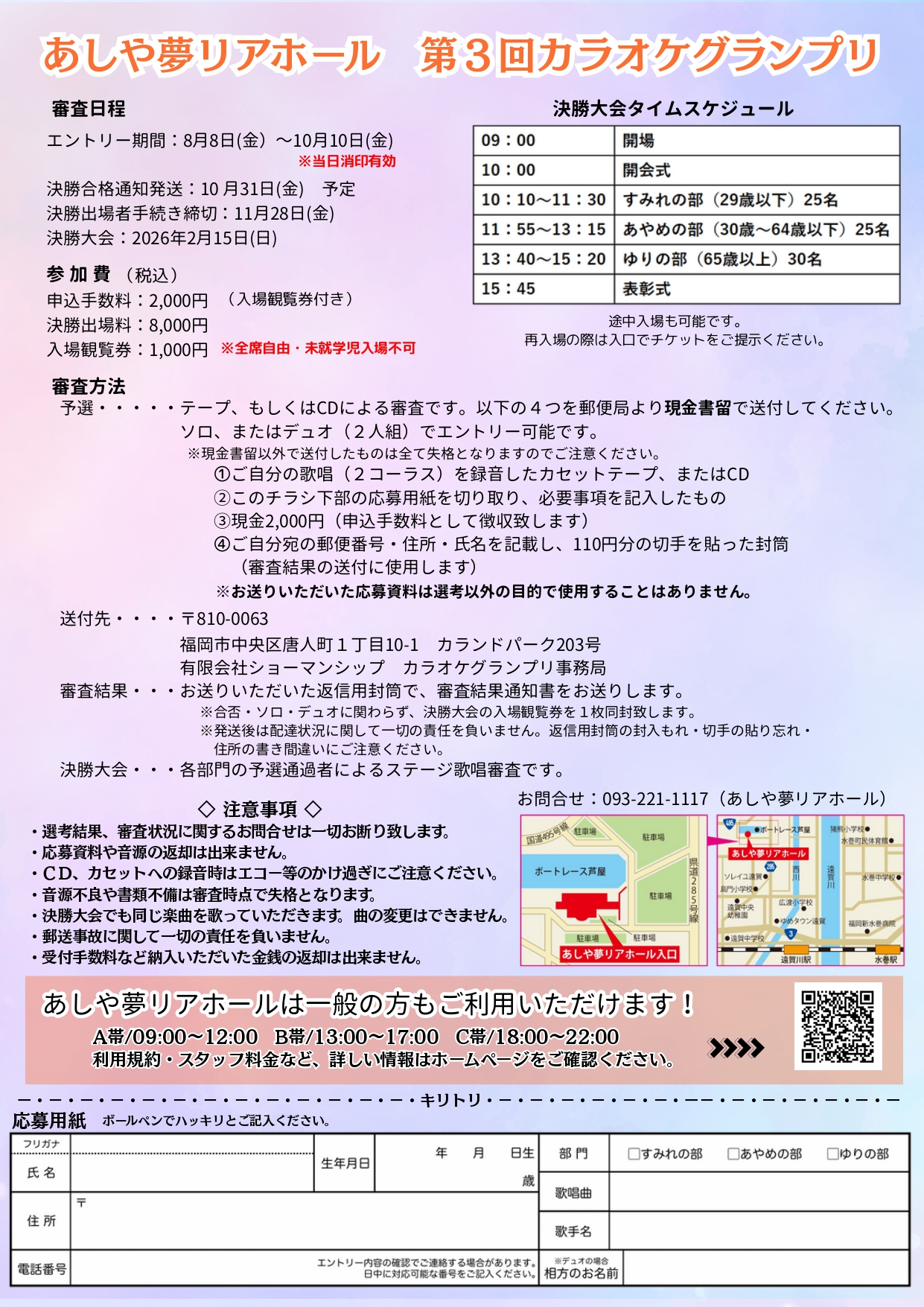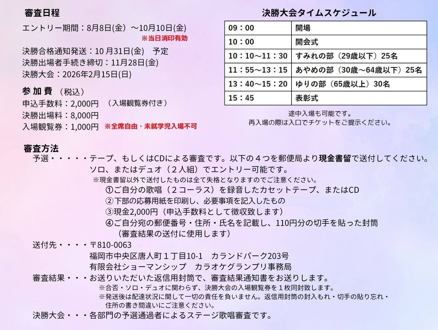 ・ | 決勝大会でも同じ楽曲を歌っていただきます。曲の変更はできません。 |