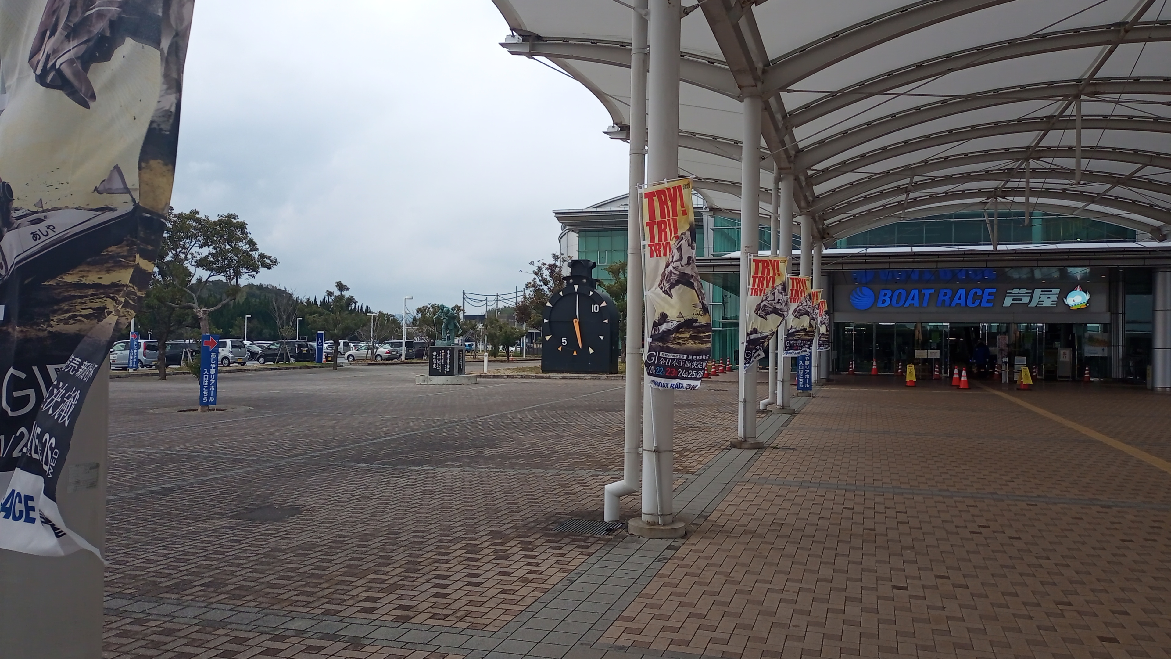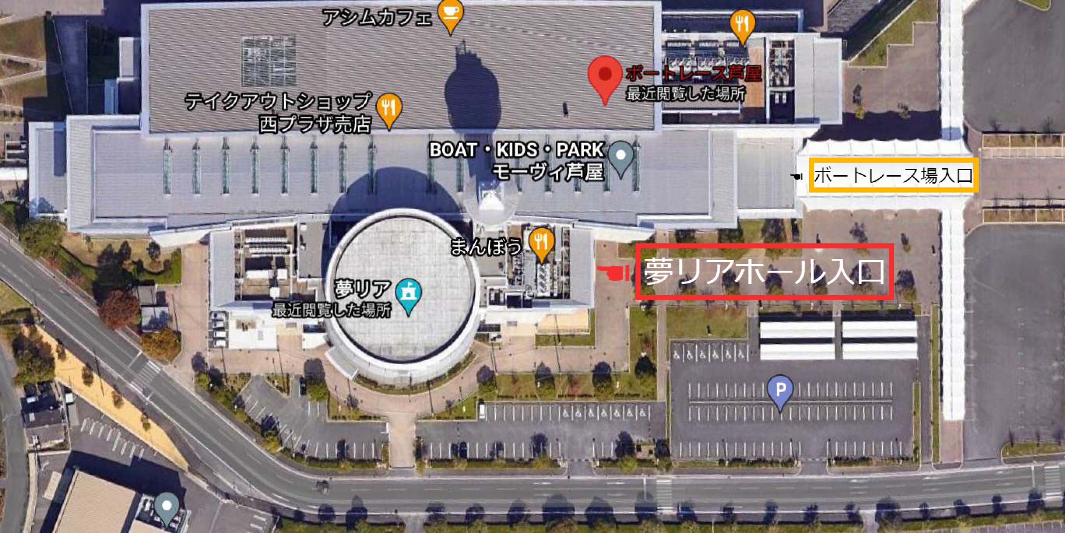 建物正面に「芦屋競艇(ボートレース場)の入口が見えます。 こちらからホールには入れません。 ※ボートレース場に入場されると、別料金が発生いたします。 |