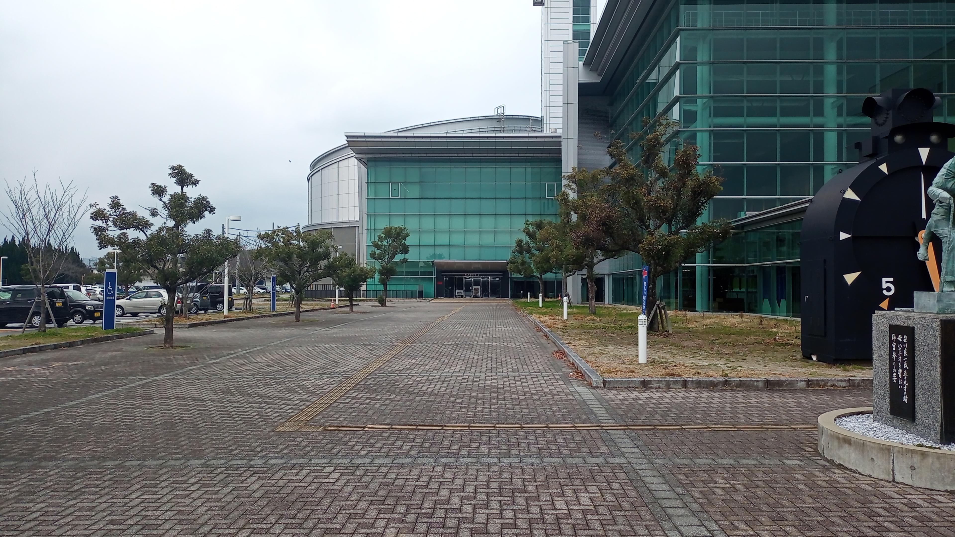 正面に四角い建物(ホール入口)が見えてきます。 正面の建物へ進んでください。 |