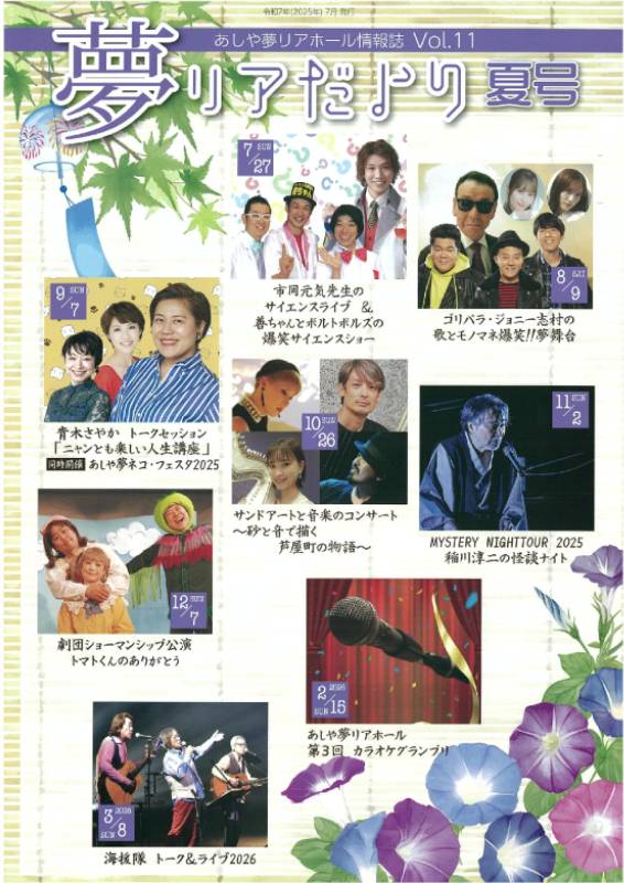 今号の表紙/10月以降のイベント 掲載内容 〇近日イベント紹介 「サンドアートと音楽のコンサート ~砂と音で描く芦屋町の物語~」 「あしや夢リアホールプレゼンツ MYSTERY NIGHT TOUR2025 稲川淳二の怪談ナイト」 「トマトくんのありがとう」 「あしや夢リアホール 第3回カラオケグランプリ」 「海援隊 トーク&ライブ2026」 〇「ご挨拶 盛暑」 〇貸しホールのご案内 |