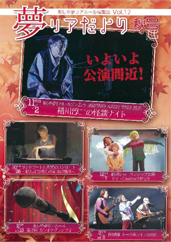 今号の表紙/10月以降のイベント 掲載内容 〇近日イベント紹介 「サンドアートと音楽のコンサート ~砂と音で描く芦屋町の物語~」 「あしや夢リアホールプレゼンツ MYSTERY NIGHT TOUR2025 稲川淳二の怪談ナイト」 「トマトくんのありがとう」 「あしや夢リアホール 第3回カラオケグランプリ」 「海援隊 トーク&ライブ2026」 〇「ご挨拶 盛暑」 〇貸しホールのご案内 |
